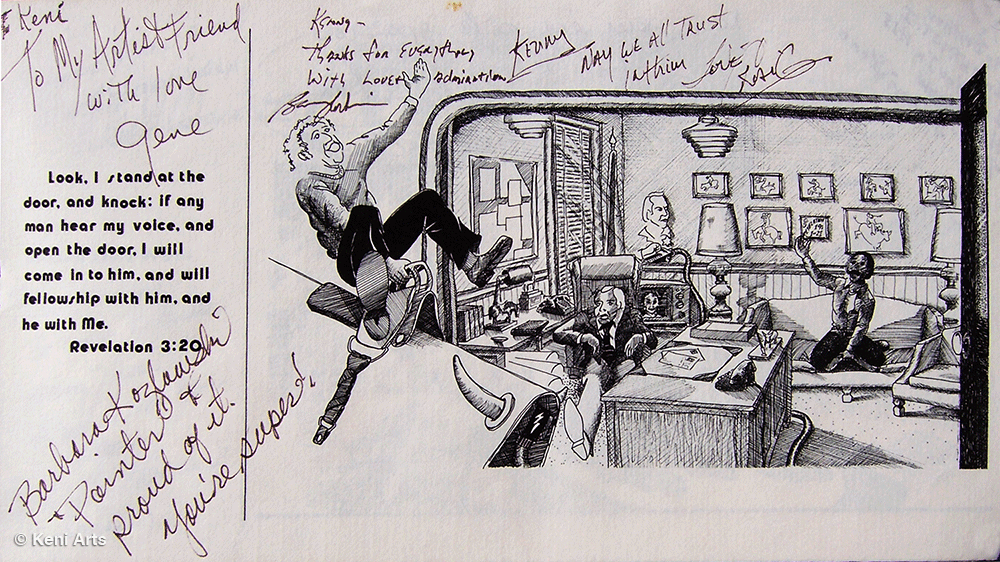 I printed a book of drawings and gave a copy to all the cast and crew of Stir Crazy on wrap day (last day of filming). We exchanged autographs. This page is autographed by Gene Wilder, “To my artist friend with love. Gene”. Only later did I learn that he was a very talented watercolorist. In the background is Richard Prior, with whom I had some interesting conversations.